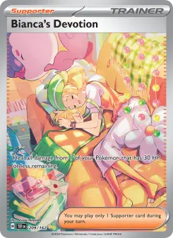 Walking Wake ex Special Art Rare (#209) leads at $35-55 near-mint with its primordial water scene. Iron Leaves ex SAR commands $25-40. The Illustration Rare Froslass ex is a collector favorite at $20-30. ACE SPEC Prime Catcher gold card holds competitive value at $15-25. Bianca's Devotion Full Art Supporter is a premium character card.